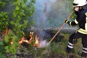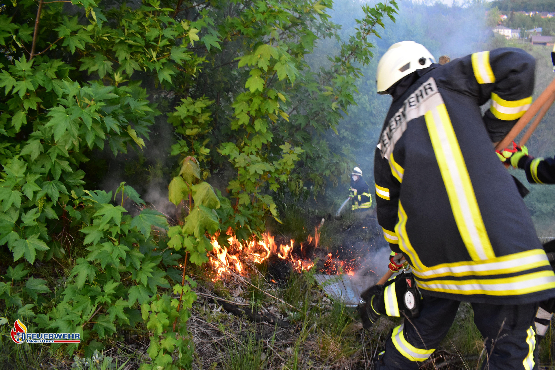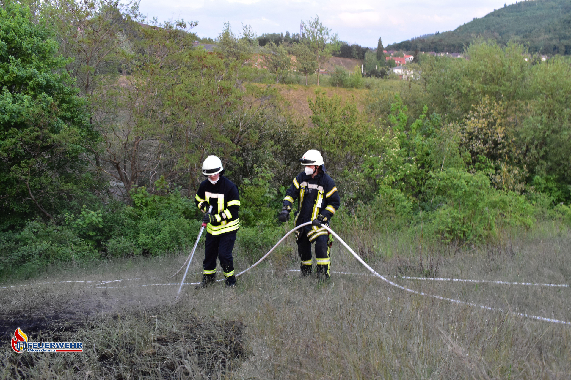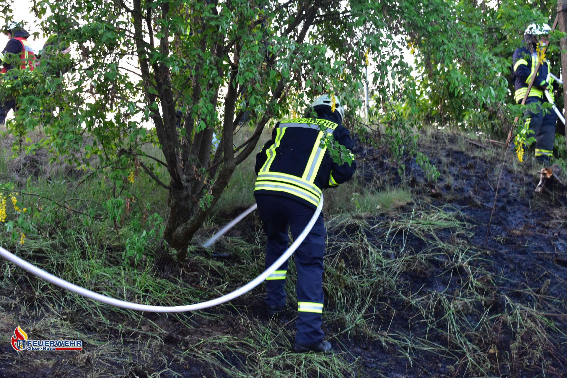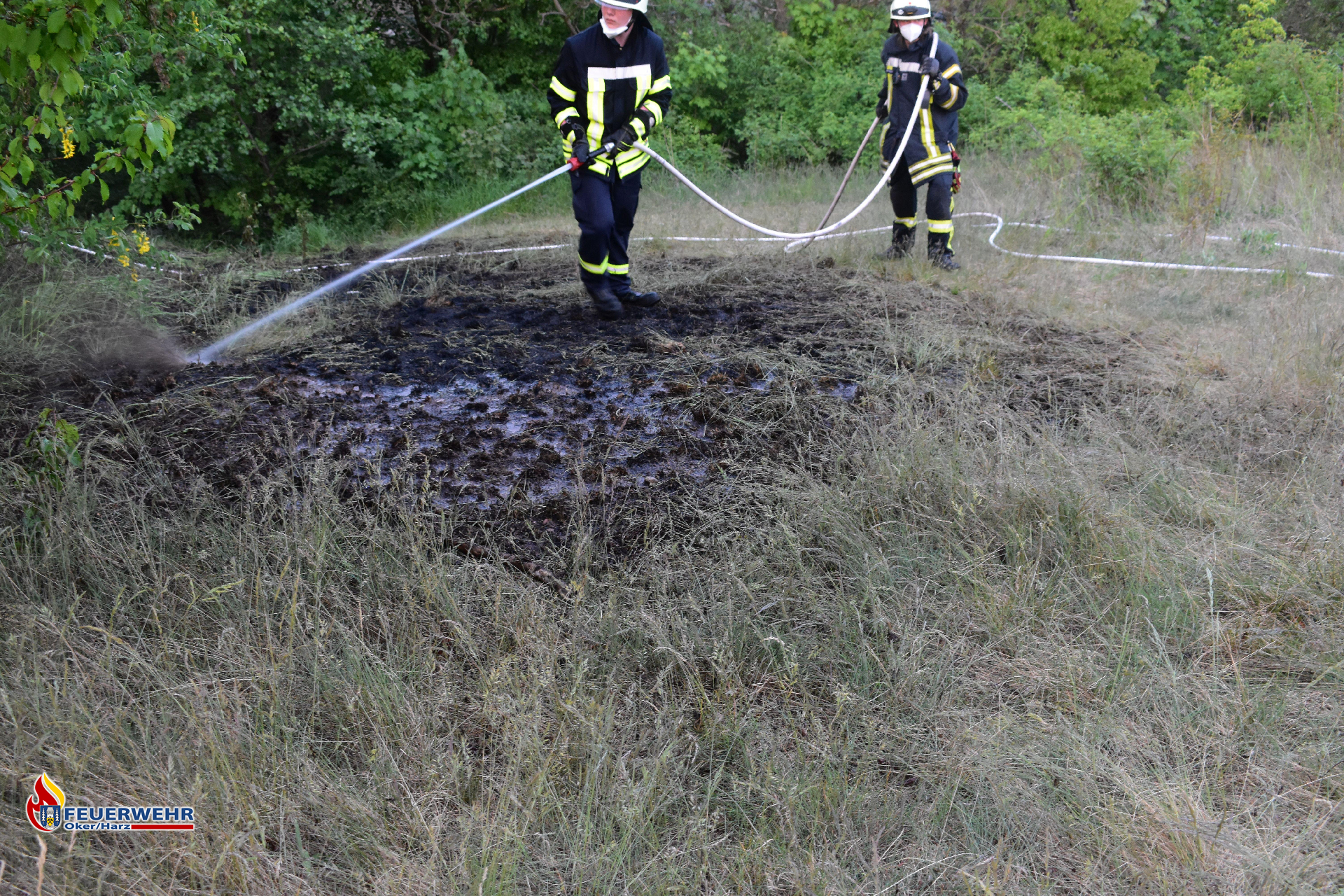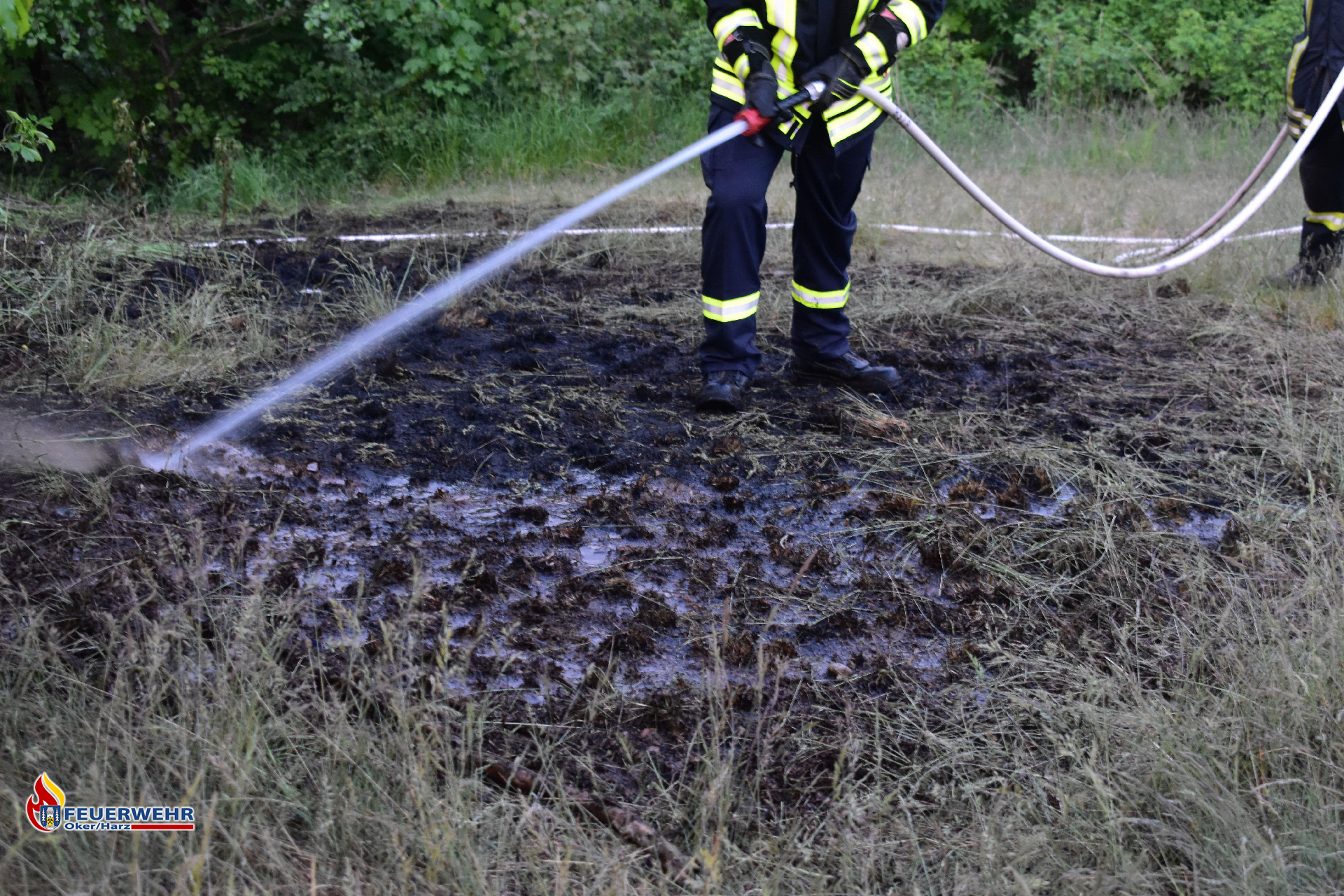 Erneut wurden wir zu einem Flächenbrand hinter einem Discounter alarmiert. Unweit des letzten Flächenbrandes, brannte erneut eine Fläche von ca. 50m². Die Einsatzkräfte der Gruppe 2 befanden sich im Ausbildungsdienst als sie den Rauch über dem Discounter sahen. Vorsorglich beendeten sie ihren Dienst, zeitgleich wurden die Einsatzkräfte zu dem Flächenbrand alarmiert. Die Gruppe 2 traf als Erstes an der Einsatzstelle ein und baute direkt einen Löschangriff auf. Als das zweite Fahrzeug vor Ort war, nahm sich die Besatzung Feuerpatschen, um am Rande des Feuers Glutnester auszudrücken. Währenddessen wurden mit unserer Waldbrandausrüstung die restlichen Flammen gelöscht. Nachdem die Flammen und die Ausbreitung gestoppt war, wurde die gesamte Fläche mit Wasser durchgespült um sicherzustellen, dass die Fläche nicht erneut anfängt zu brennen. Nach ca. 30 Minuten war der Einsatz beendet und die Einsatzstelle wurde der Polizei übergeben.