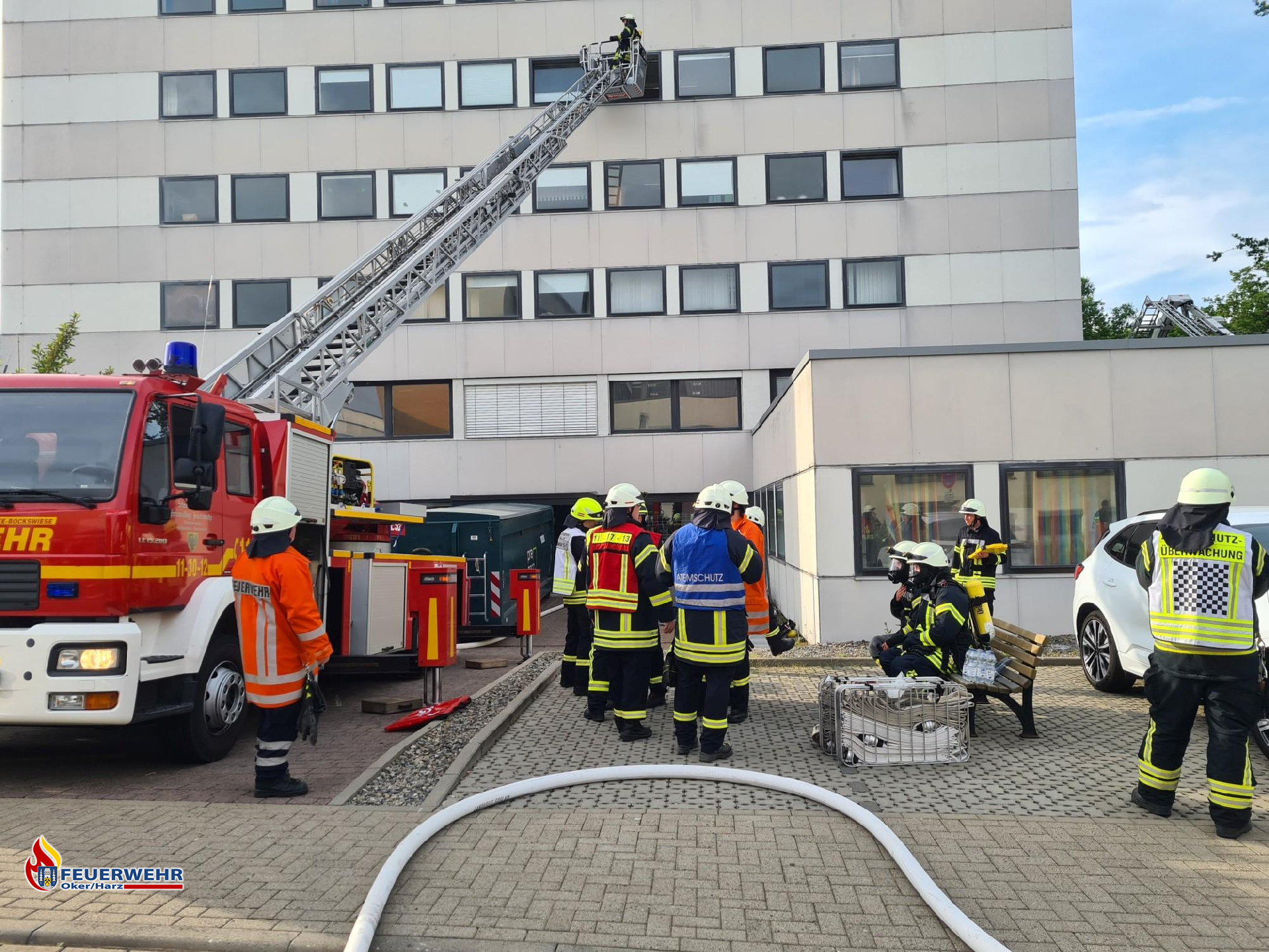 Kurz nachdem sich ein Trupp von uns sich bei der Atemschutzüberwachung angemeldet hatte, gab es ein „May Day“ im Gebäude. Zusammen mit einem Trupp aus Jerstedt, gingen wir ins sechste Obergeschoss und holten einen verunfallten Kameraden aus dem Gebäude. Außerhalb wurde der Verunfallte dann vom Atemschutzgerät getrennt und auf eine Krankentrage verlegt. Währenddessen baute die Besatzung des Löschgruppenfahrzeuges eine Wasserversorgung zum Teleskopmast der Feuerwehr Langelsheim auf.