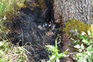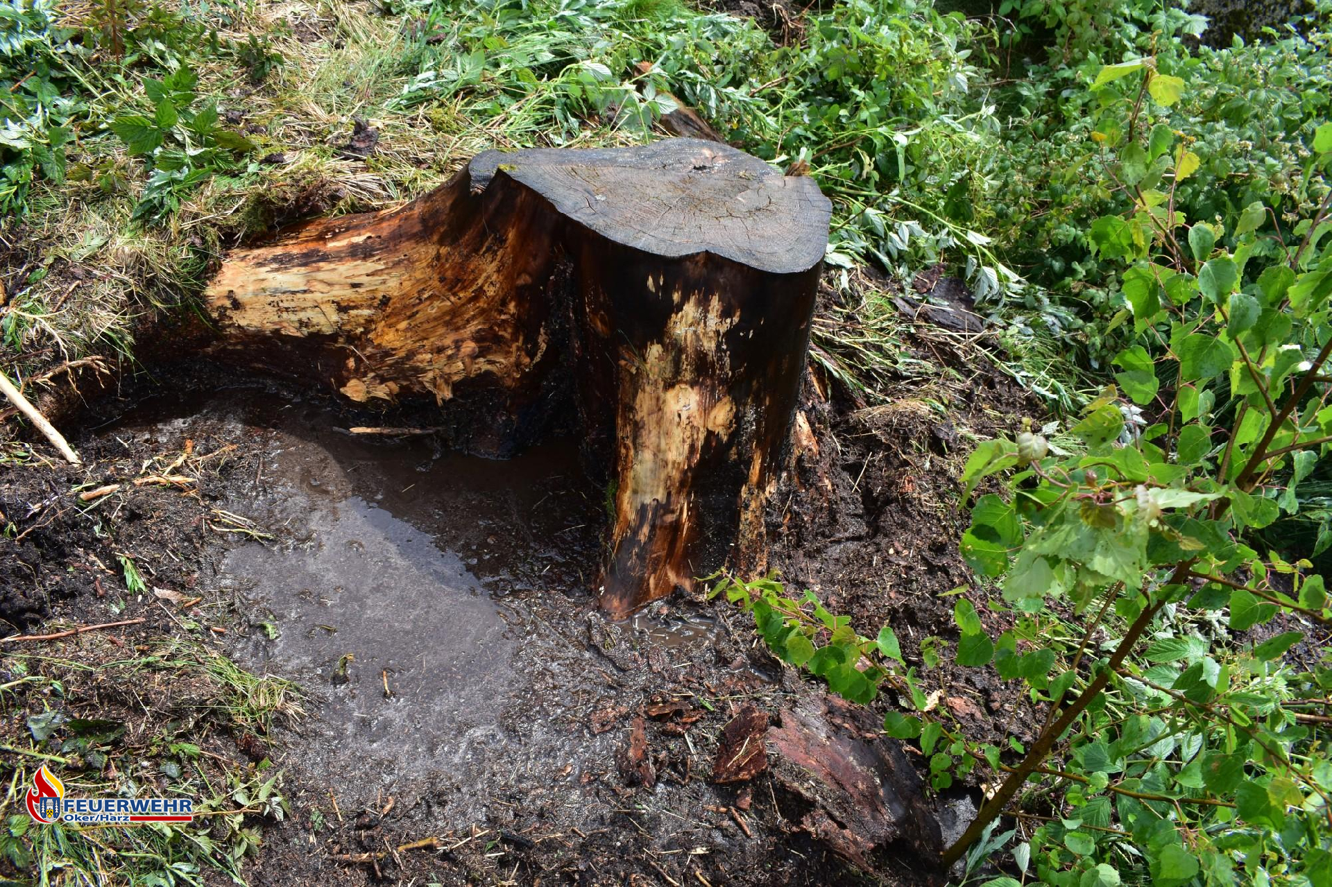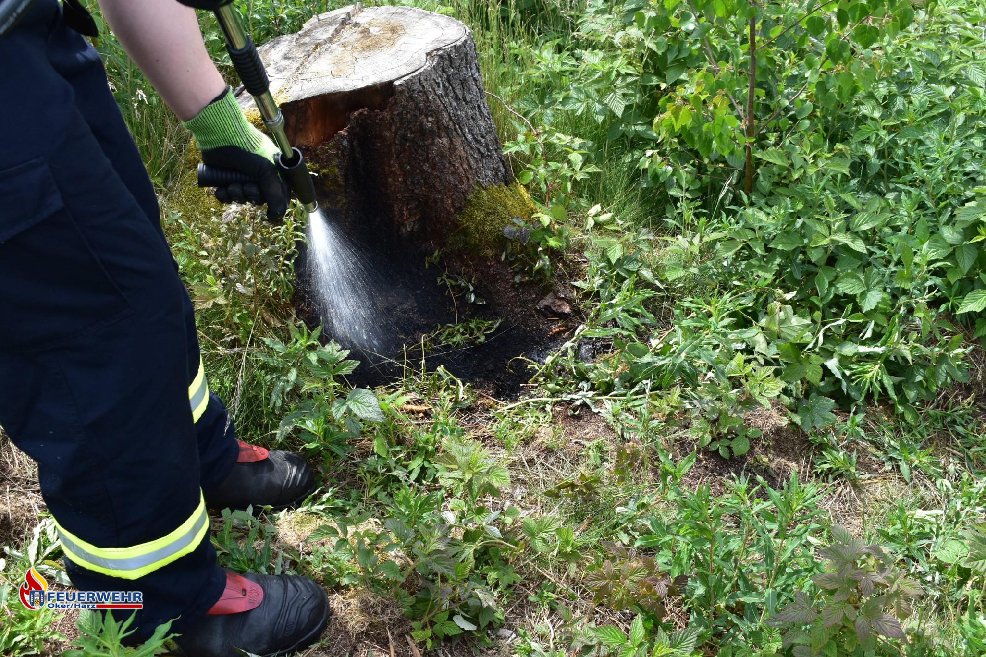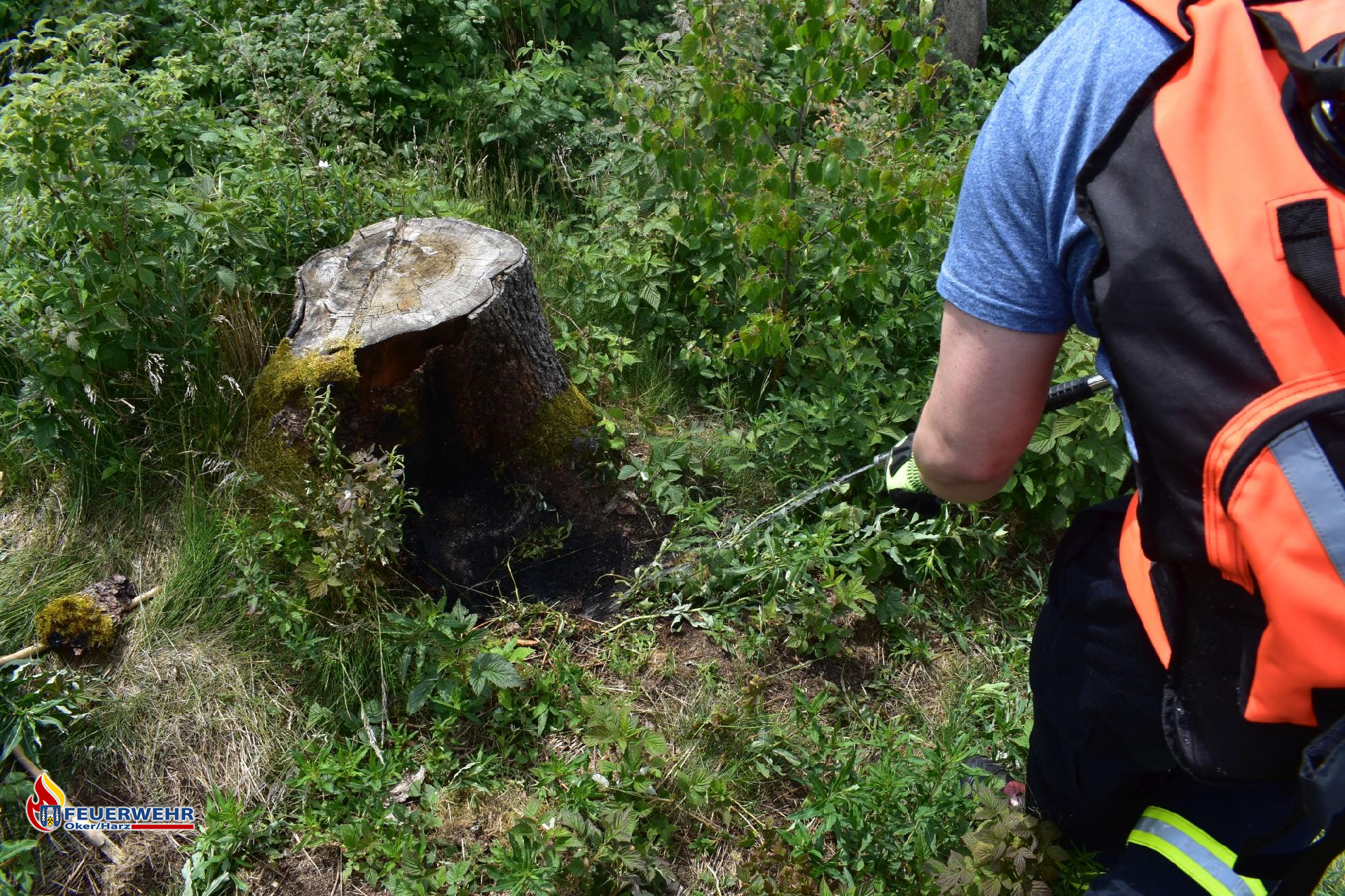 Am frühen Sonntagmittag entdeckten Wanderer am Ziegenrücken, während einer Pause, einen Qualmenden Baumstumpf, der sich hinter einer Hütte befand. Unser Ortsbrandmeister fuhr zur Erkundung voraus, während die Löschfahrzeuge in einem Bereitstellungsraum warteten. Nachdem der Einsatztort ausfindig gemacht war, fuhr ein Löschfahrzeug zur Brandbekämpfung in den Wald. Mit dem Löschrucksack wurde ein erster Löschversuch unternommen. Da sich das Feuer bereits in den Stumpf vertieft hatte, wurde eine Schlauchleitung aufgebaut und die Umgebung durchgespült, um sicherzugehen, dass es keine Brandausbreitung gibt.