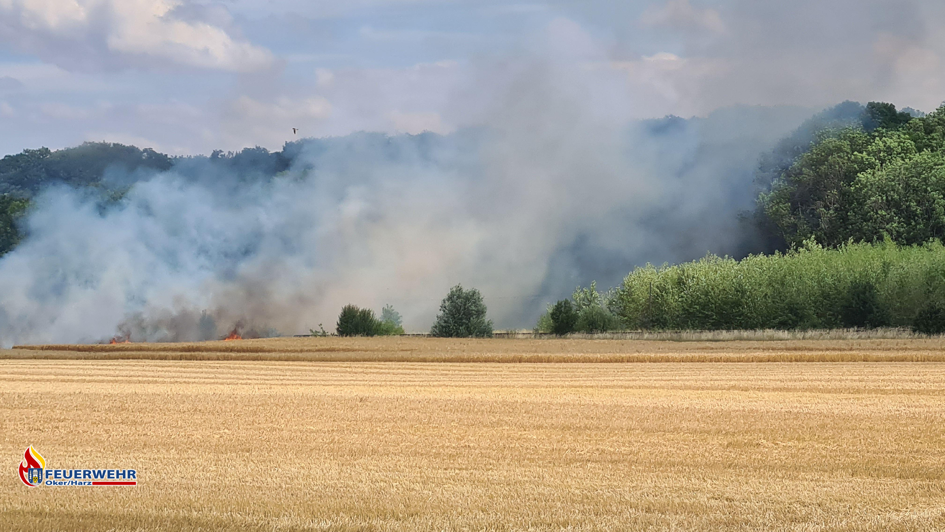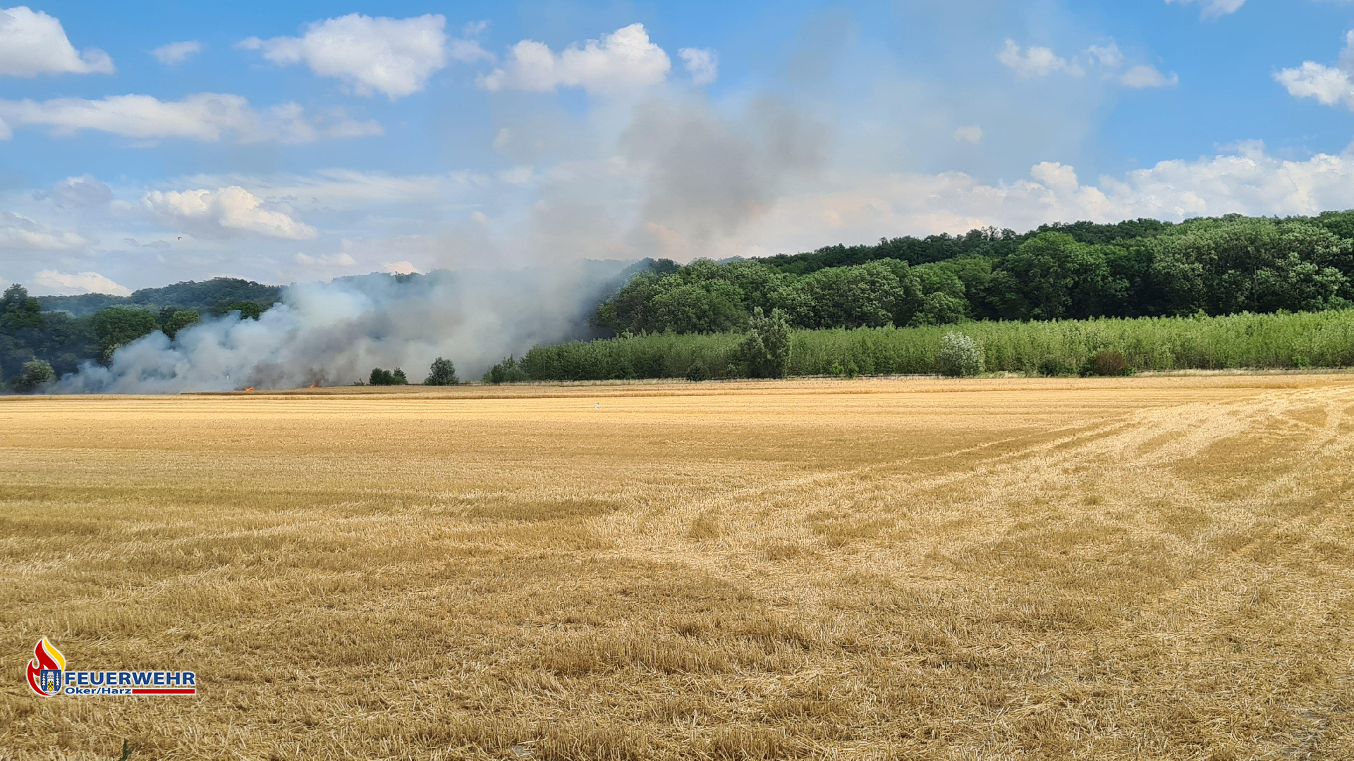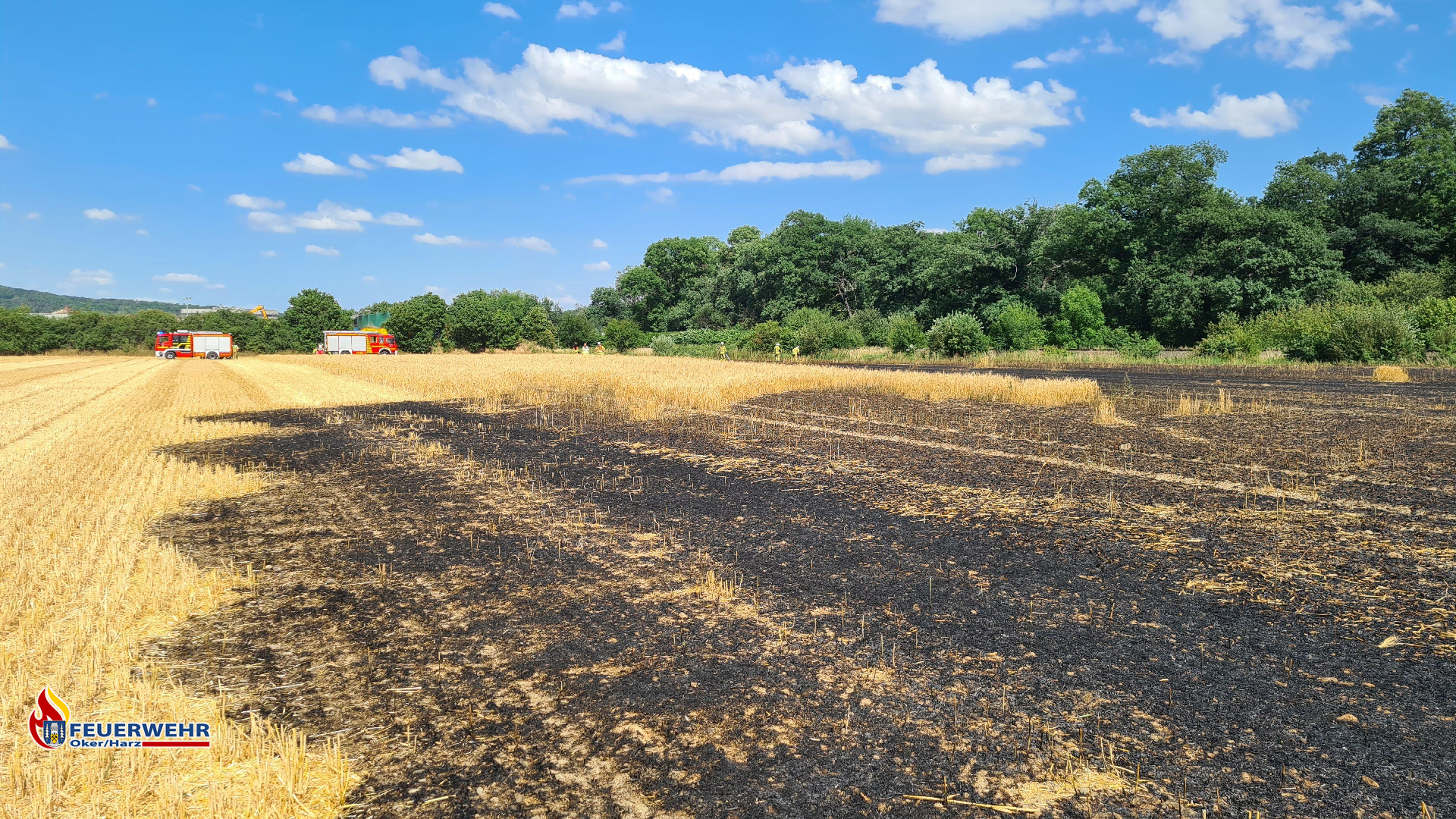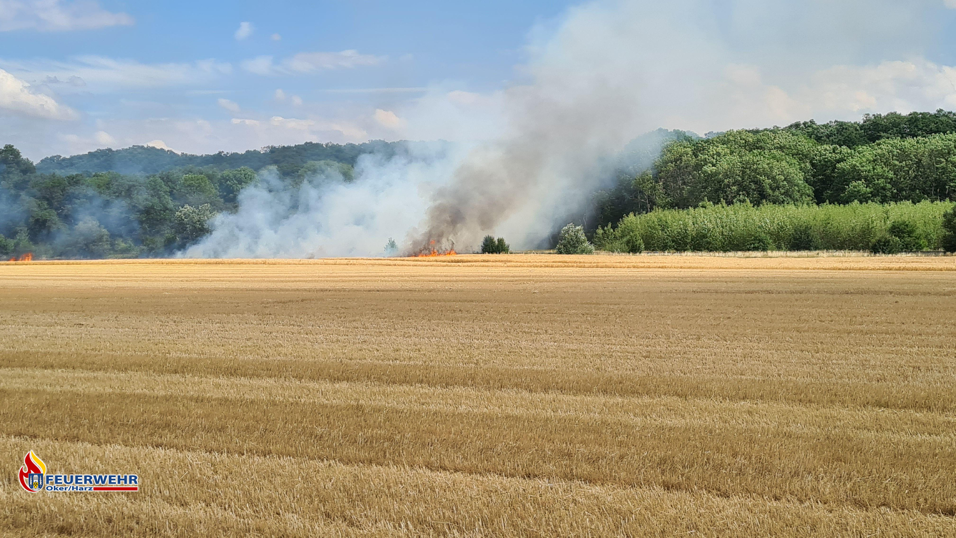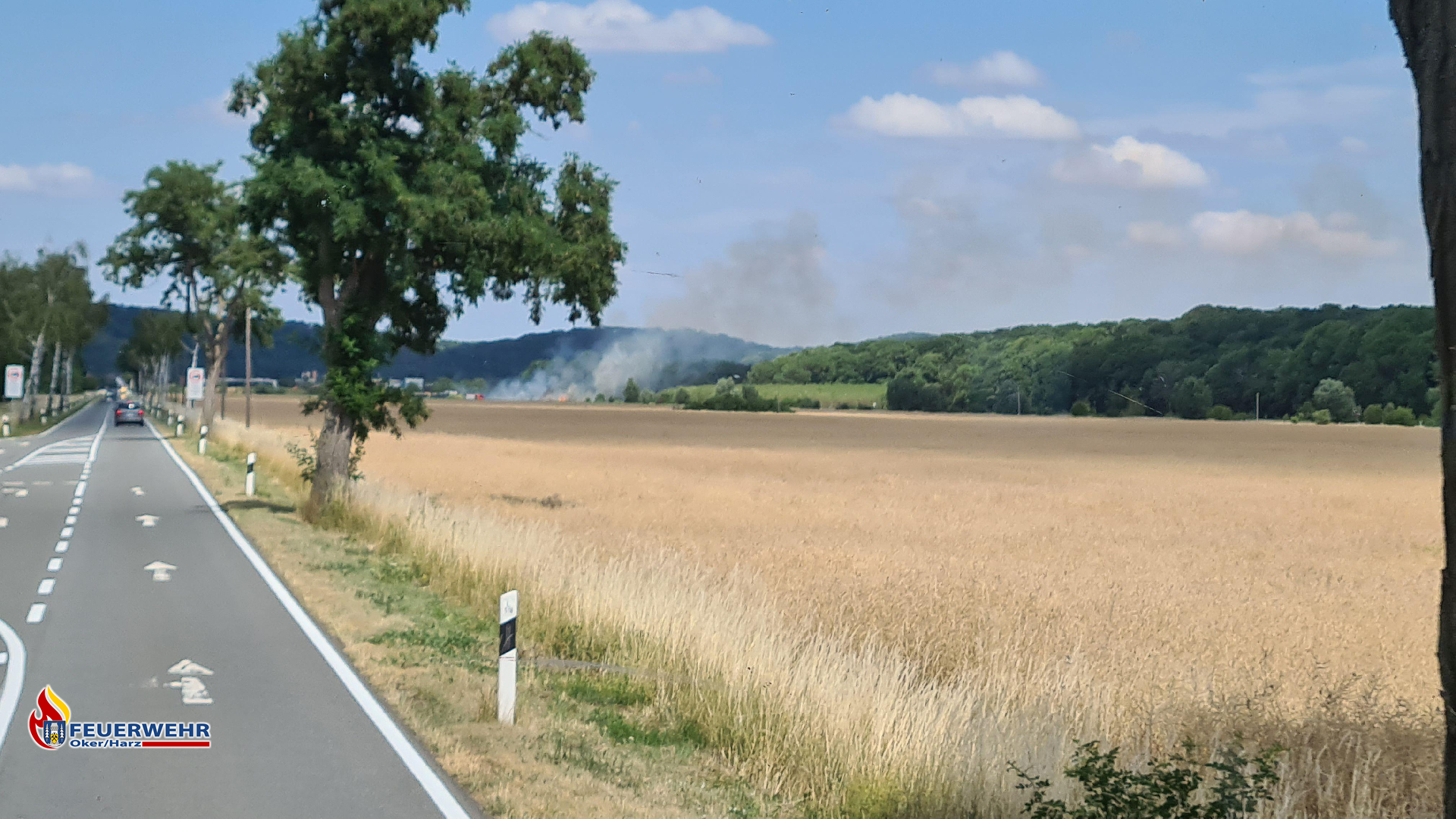 Kurz nachdem die Gerätschaften des letzten Einsatzes verstaut waren und die ersten Kameraden zuhause ankamen, gab es um 14:41 Uhr einen weiteren Einsatz auf der L518 Richtung Vienenburg. Dort sollte ein Mähdrescher und das Feld brennen. Bereits auf der Anfahrt sah man die Rauchsäule, die nichts Gutes verheißen konnte. Am Einsatzort angekommen, konnte das Einsatzgebiet schnell in zwei Abschnitte eingeteilt werden. Zu einem galt es, den Mähdrescher zu löschen als auch die Ausbreitung des Feldbrandes zu stoppen.