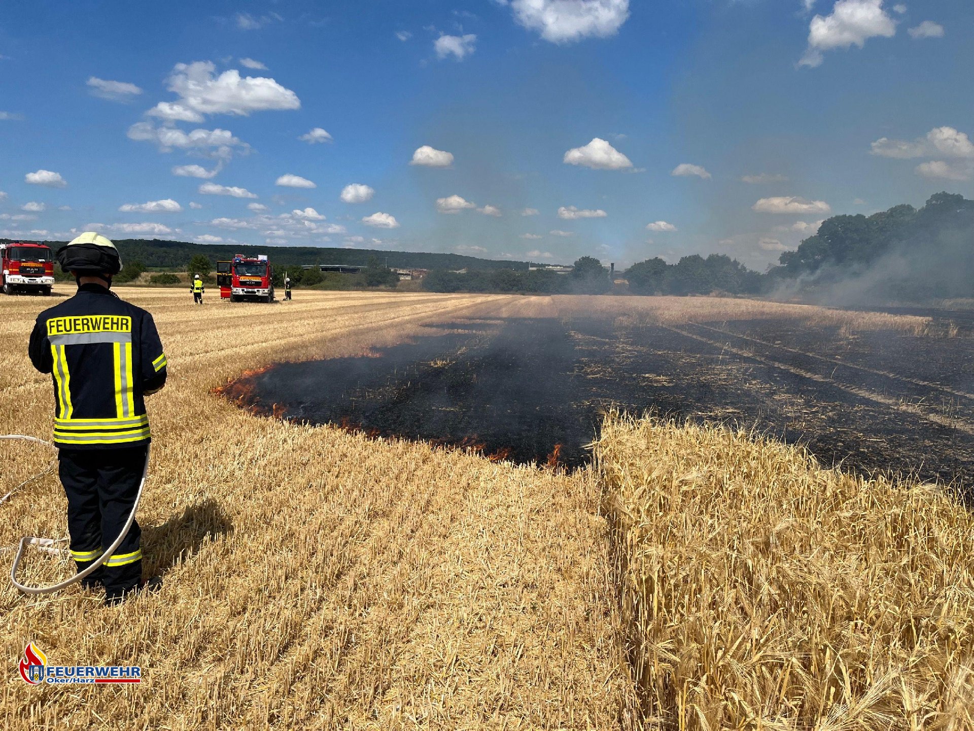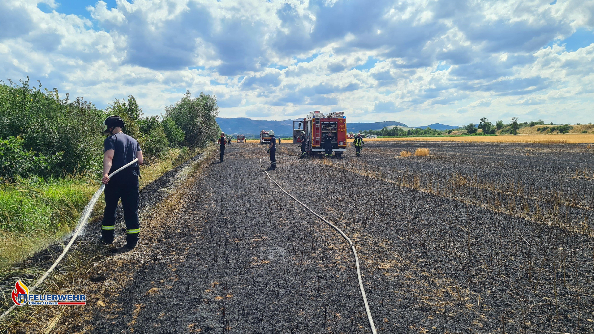 Die zuerst eintreffende Feuerwehr Vienenburg, kümmerte sich mit ihrem Fahrzeug um den Mährescher, der sich nicht im Gefahrenbereich aufhielt. Da wir als Zweites ankamen, hieß es für uns Ausbreitung stoppen. Mit Feuerpatschen, Löschrucksäcken und einem D-Strahlrohr ging es zur Brandbekämpfung. Die Flammen bahnten sich rasch einen Weg durch das Getreidefeld. Allerdings konnten die Flammen in wenigen Minuten mit Feuerpatschen und dem Wasser der Löschrucksäcke schnell unter Kontrolle gebracht werden. Die Feuerwehr Harlingerode übernahm den linken Brandabschnitt, während wir uns mit der Feuerwehr Goslar um den mittleren und rechten Brandabschnitt kümmerten.