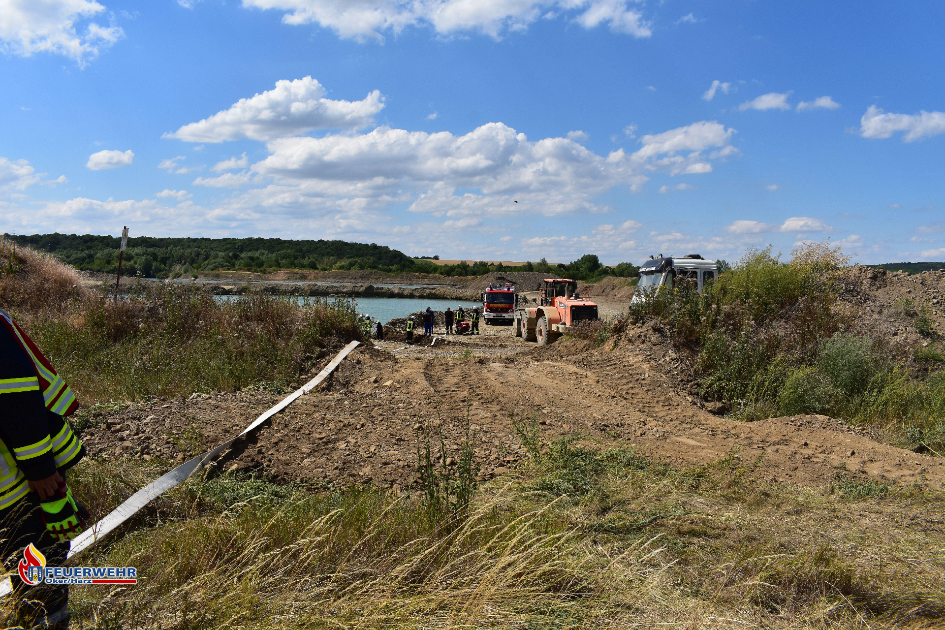 Mit den D-Strahlrohren der Waldbrandausrüstung wurde der Rand des Feldes, der zum Teil noch 100 Grad hatte, gekühlt. Da wir eine Wasserversorgung benötigten, wurde mit einem Bagger ein Zugang zum nahegelegenen Kiesteich eröffnet. Mit der Tragkraftspritze unseres zweiten Löschfahrzeugs wurden die leeren Fahrzeuge wieder befüllt. Nachdem das Feld nochmals mit der Wärmebildkamera kontrolliert wurde und keine weiteren Wärmequellen ausfindig gemacht wurden, war nach ca. 80 Minuten Einsatzende.