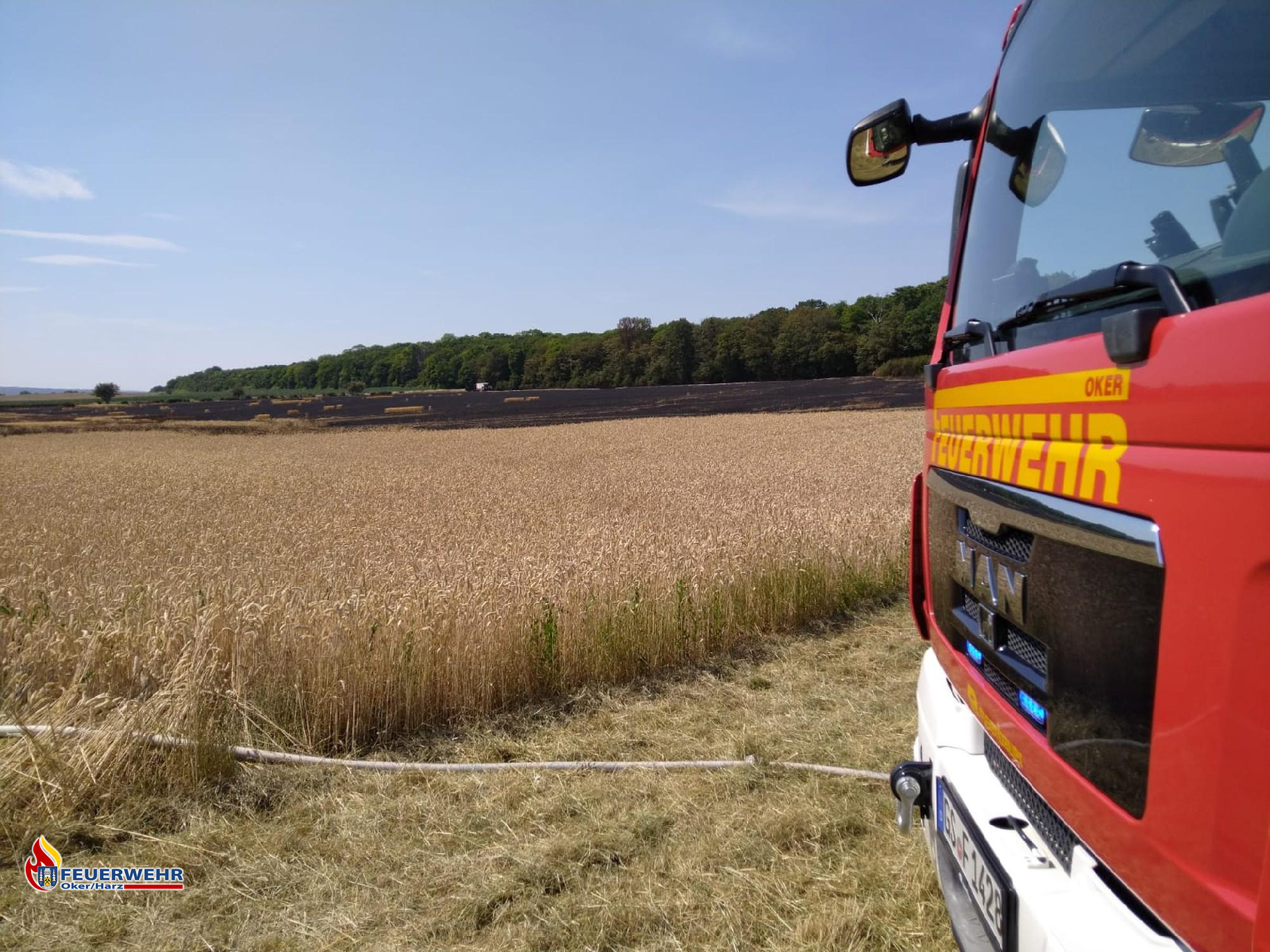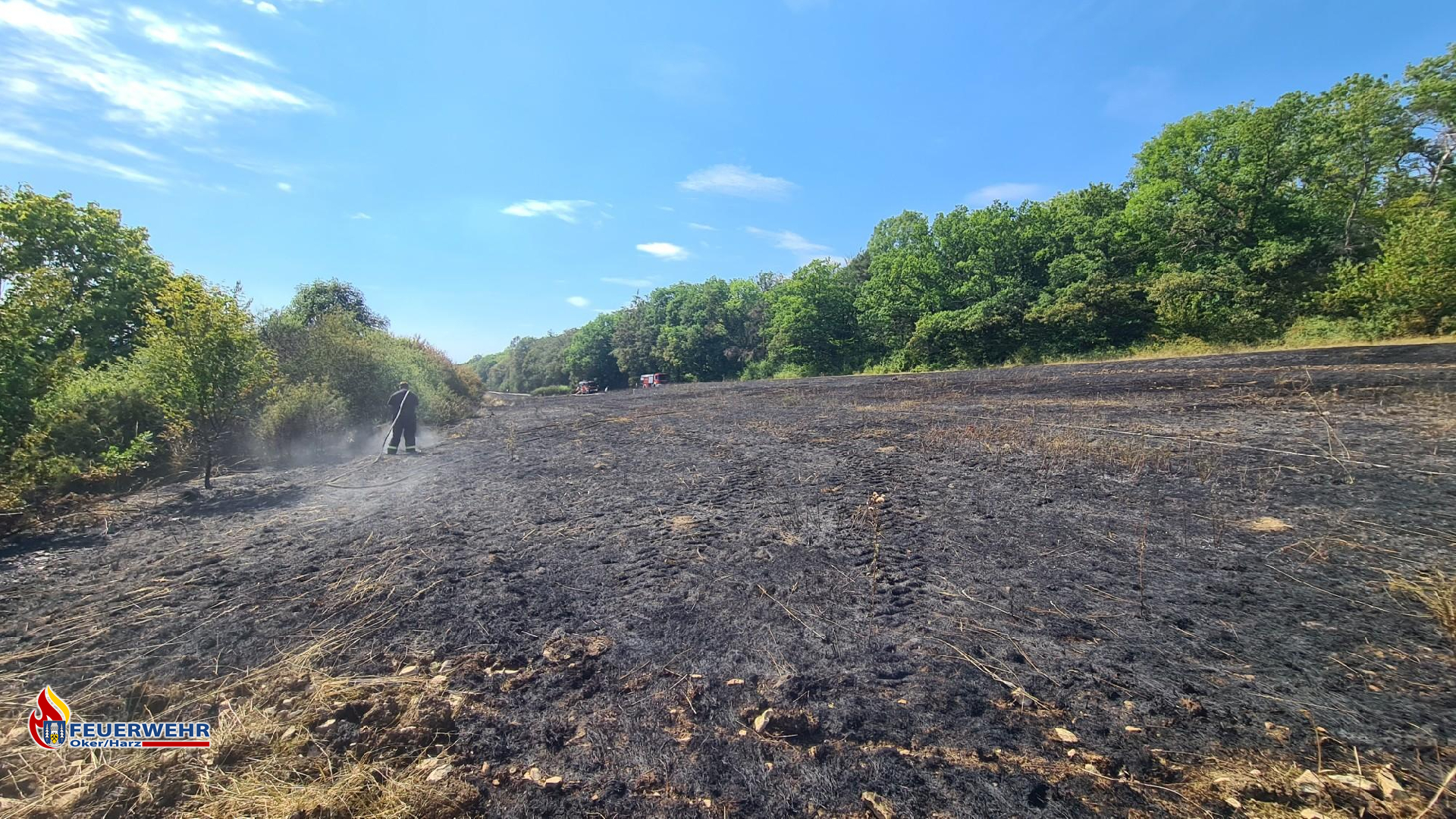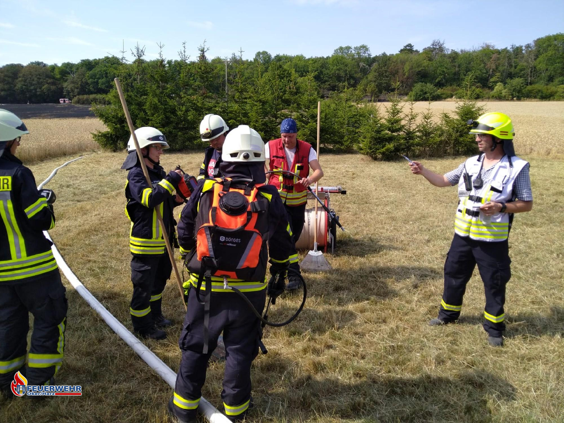 Während es noch im Wald brannte, wurde das Getreidefeld auf Glutnester kontrolliert und gewässert. Hier kamen mehrere D-Strahlrohre sowie Löschrucksäcke und Feuerpatschen zum Einsatz.