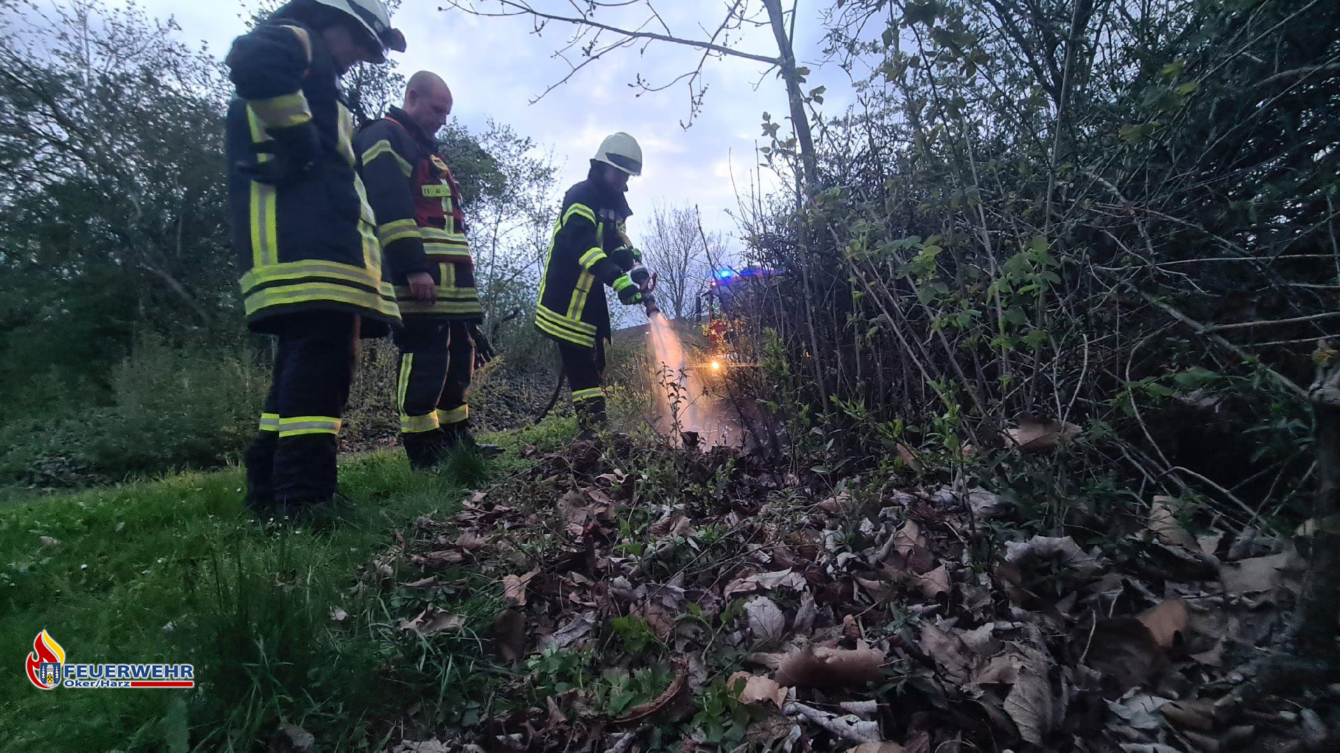Dort angekommen, war das Feuer so weit heruntergebrannt, dass wir nur noch die letzten Flammen und Glutnester abgelöscht haben.