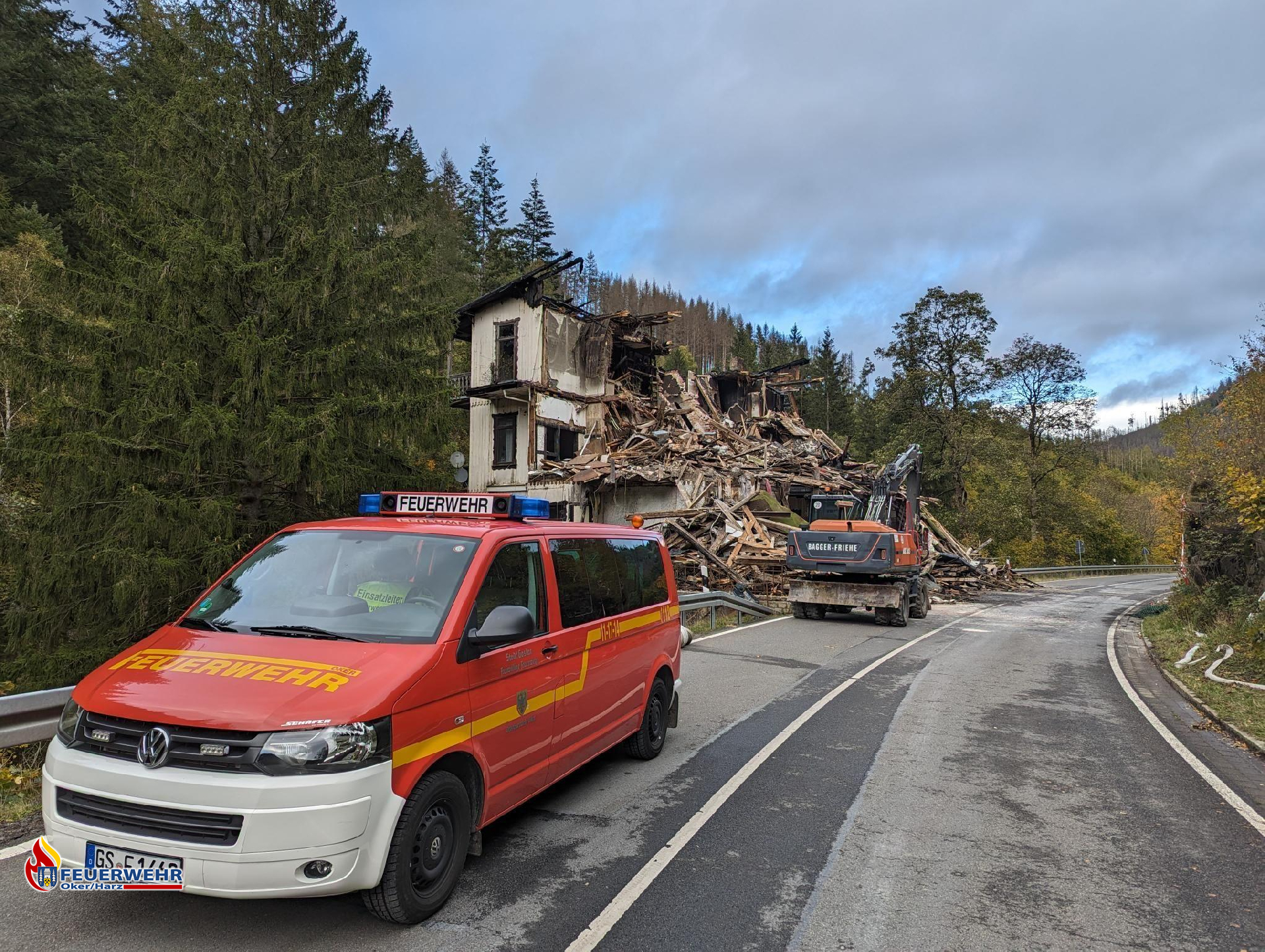 Im Laufe des Einsatzes wurden Fachberater von der Forst, der Straßenmeisterei Braunlage und der unteren Wasserbehörde zugezogen. Außerdem wurde nach Absprache mit dem Mitarbeiter vom Ordnungsamt der Stadt Goslar, dem Stadtbrandmeistern und dem Einsatzleiter die Firma Bagger Friehe kontaktiert, damit das Gebäude abgerissen werden kann, um restliche Glutnester ablöschen zu können.