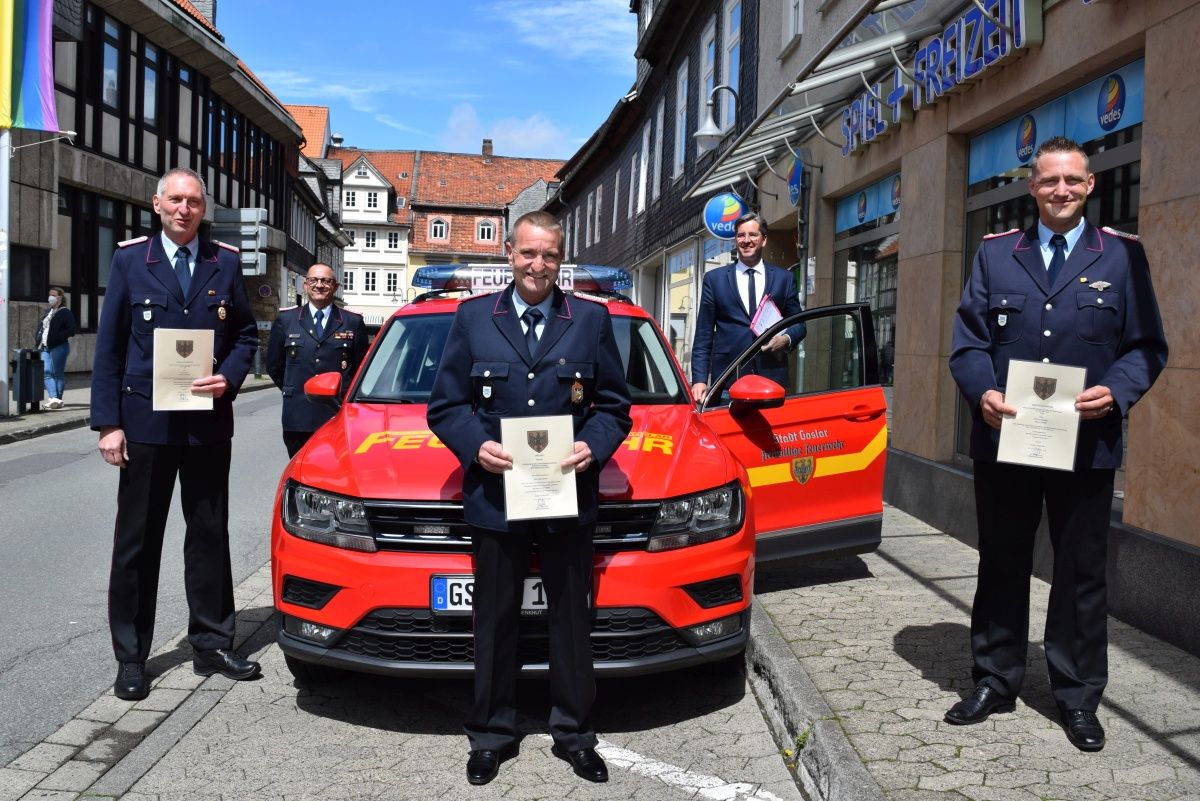 Nach 17 Jahren ist Schluss in der Ortswehrführung für Noch-Ortsbrandmeister Hans-Jürgen Bothe. Am Dienstag, den 18. Mai 2021 ernannte Oberbürgermeister Dr. Oliver Junk den bisherigen Stellvertreter Florian Rowold zum 1. Juni zu Bothes Nachfolger. Damit folgte er der Vorschlagswahl, die die Mitglieder der Feuerwehr Oker bereits im März durchgeführt hatten. Neuer Stellvertreter wird der bisherige Gerätewart und Zugführer Thomas Rademacher.